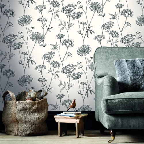 Caractéristiques du Papier peint intisséFleuri gravure Noir, écru